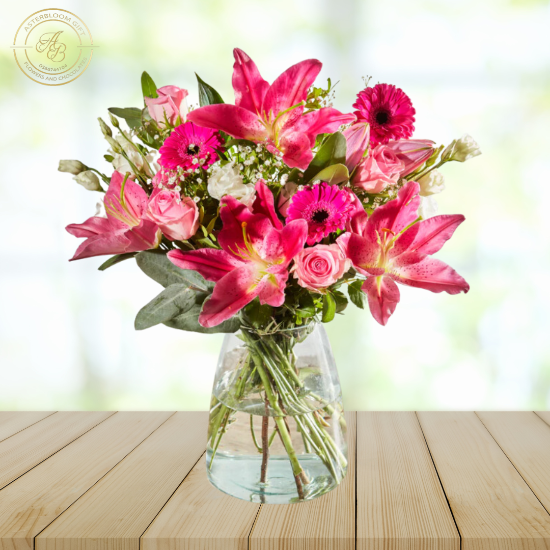 This charming bouquet is a celebration of pink, showcasing Fairtrade roses, lisianthus, and germini, each presenting their unique and stunning shades. The captivating pink oriental lilies add a touch of elegance to the arrangement, making it a delightful choice for any occasion.