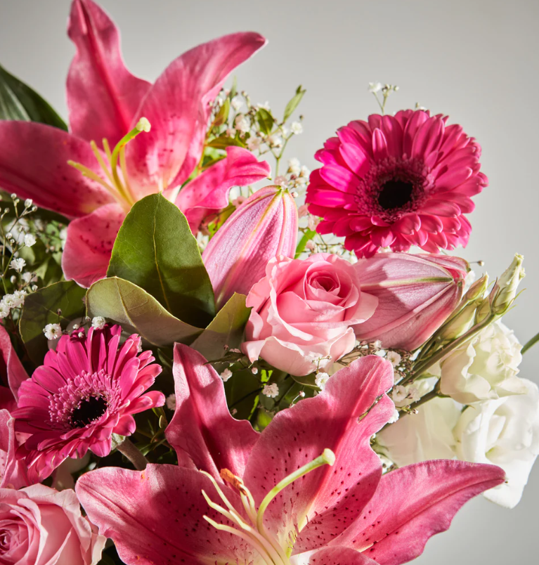 Our talented florists carefully assemble this stunning bouquet, featuring the following beautiful blooms: Pink oriental lilies, Whisper germini, Fairtrade pink roses, white lisianthus, white gypsophila, eucalyptus cinerea, and salal foliage.